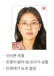 빛이 반사되거나 얼굴 윤곽을 가리는 사진은 제출 불가함 - 이어폰, 헤드폰 등 무선 핸즈프리는 착용 불가함